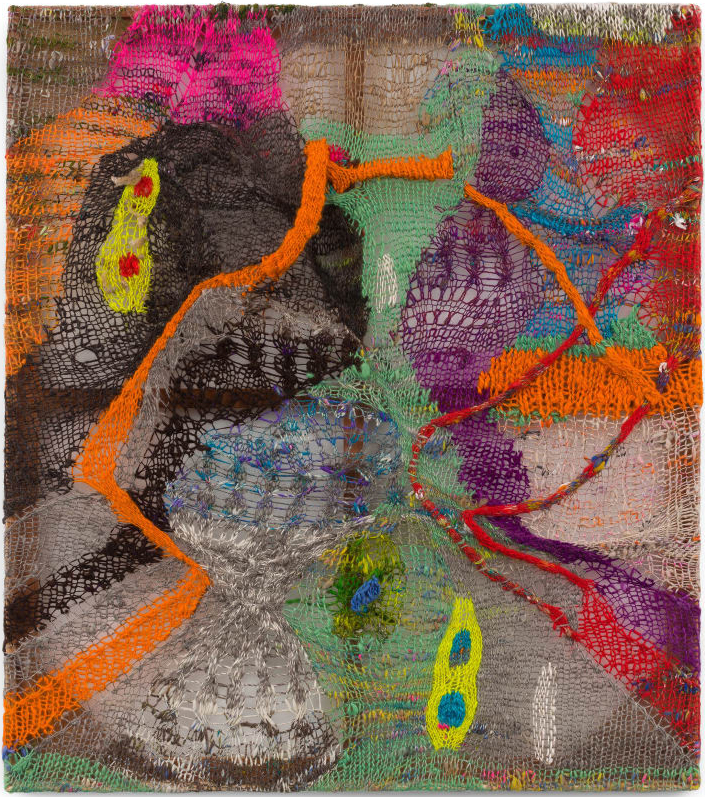 Channing Hansen, M: 4, 2018. Hand spun, hand dyed wool; synthetic fibres; and redwood. 50 5/8 x 45 1/8 in. Image courtesy the artist and Stephen Friedman Gallery.